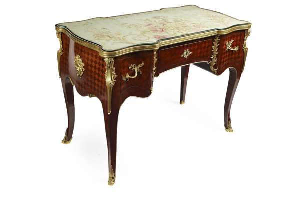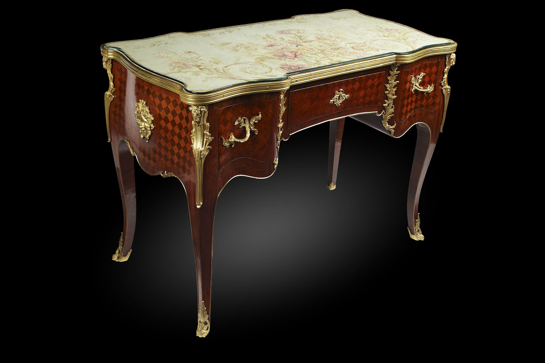 LOUIS XV STYLE KINGWOOD AND TULIPWOOD PARQUETRY AND GILT BRONZE MOUNTED DRESSING TABLE