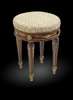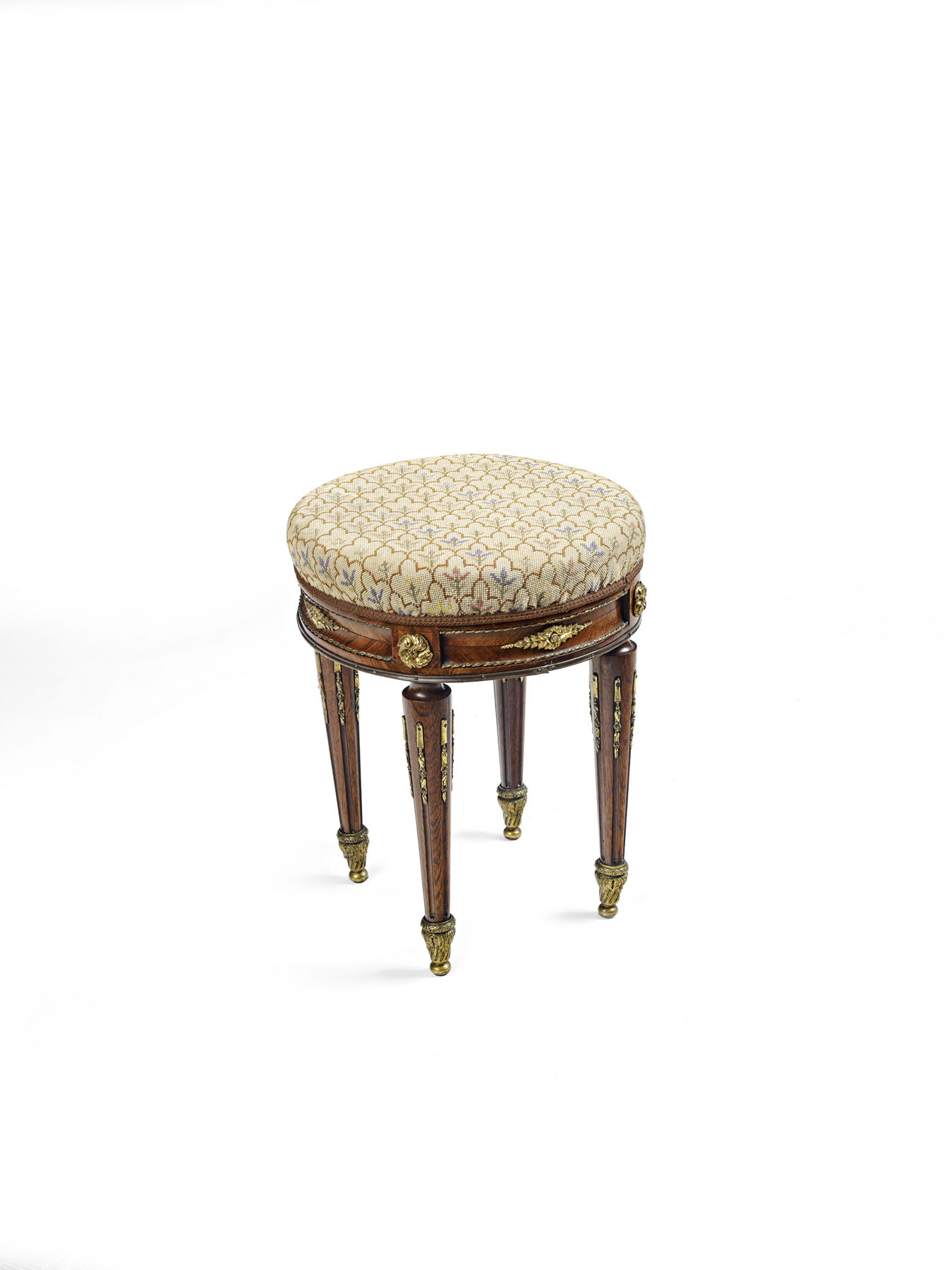 the circular needlework upholstered top over a frieze with recessed panels divided by gilt bronze rosettes and centred by foliate mounts, raised on fluted tapered circular legs terminating on gilt bronze foliate cast feet