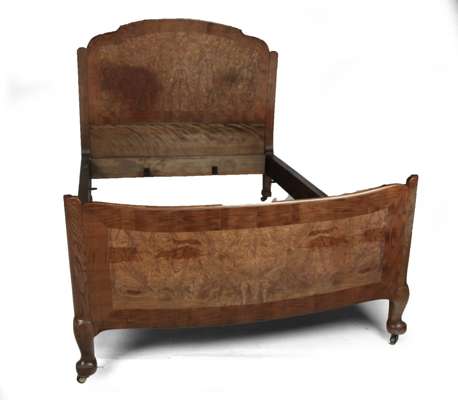 the shaped arched headboard 137cm wide, 128cm high, with crossbanding, with a conforming footboard and rails; together with the original boxspring