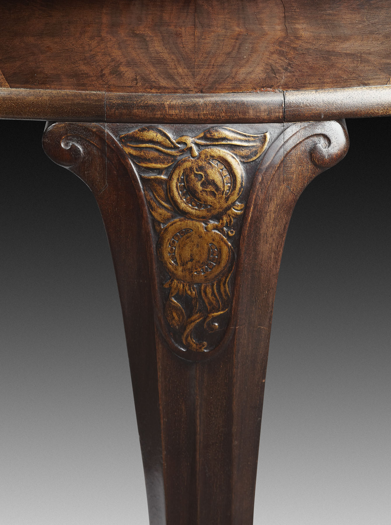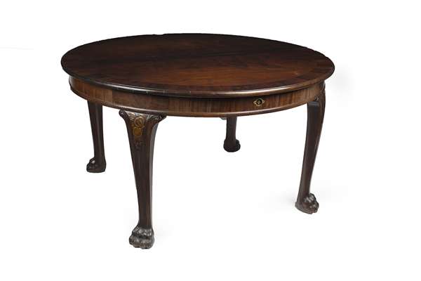 the D-end crossbanded top over a plain frieze, raised on tapering legs capped by carved fruit and foliate gilt panels and terminating on paw feet,the mechanical extending action with four leaves and crank