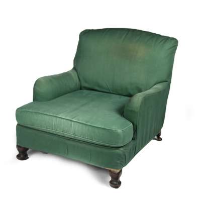 the low upholstered back over a long T-shape cushion and upholstered arms, in a green slipcover, raised on short shaped feet