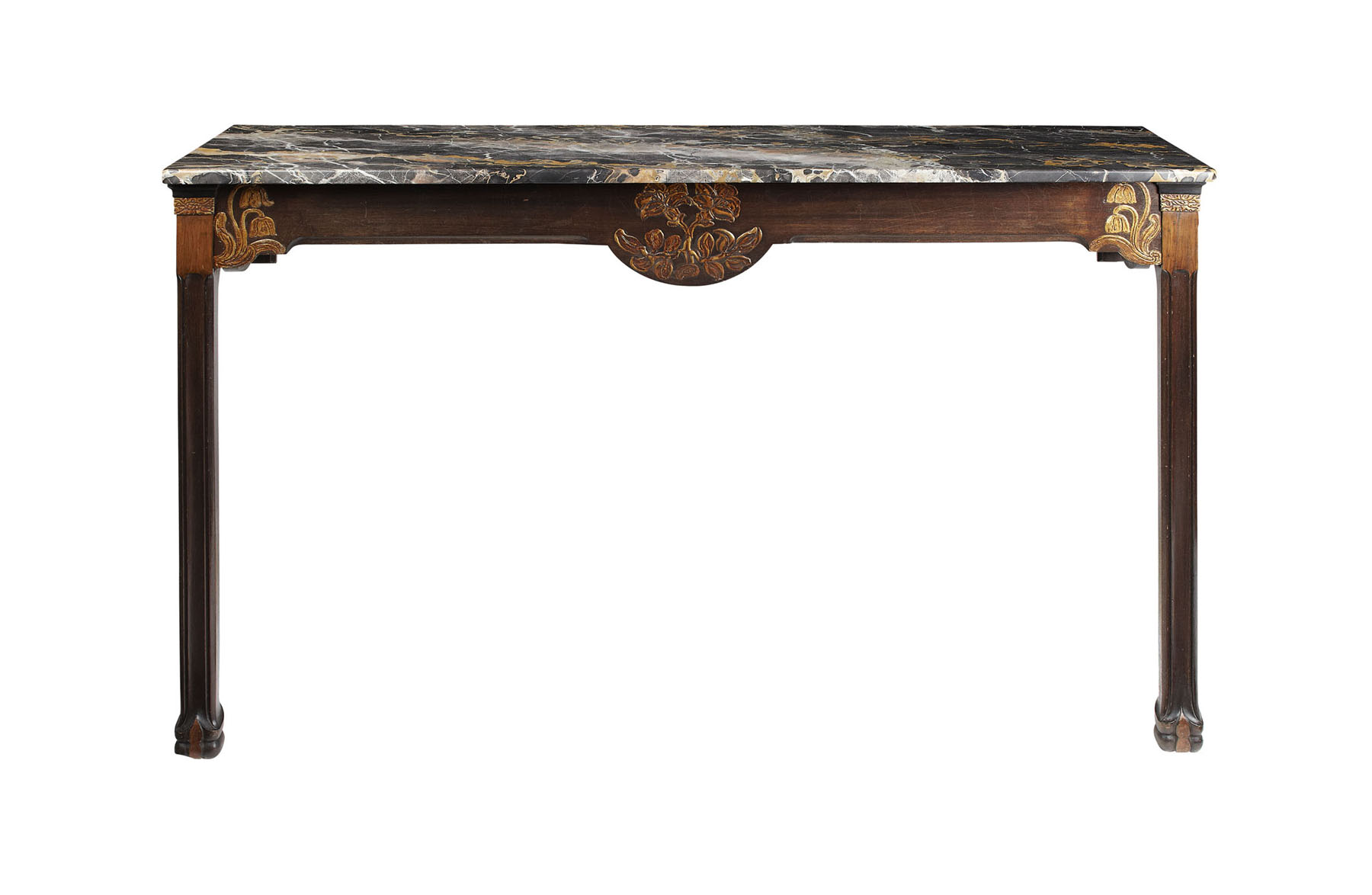 the rectangular grey veined marble top over a foliate carved frieze, raised on straight reeded square legs ending on shaped block feet