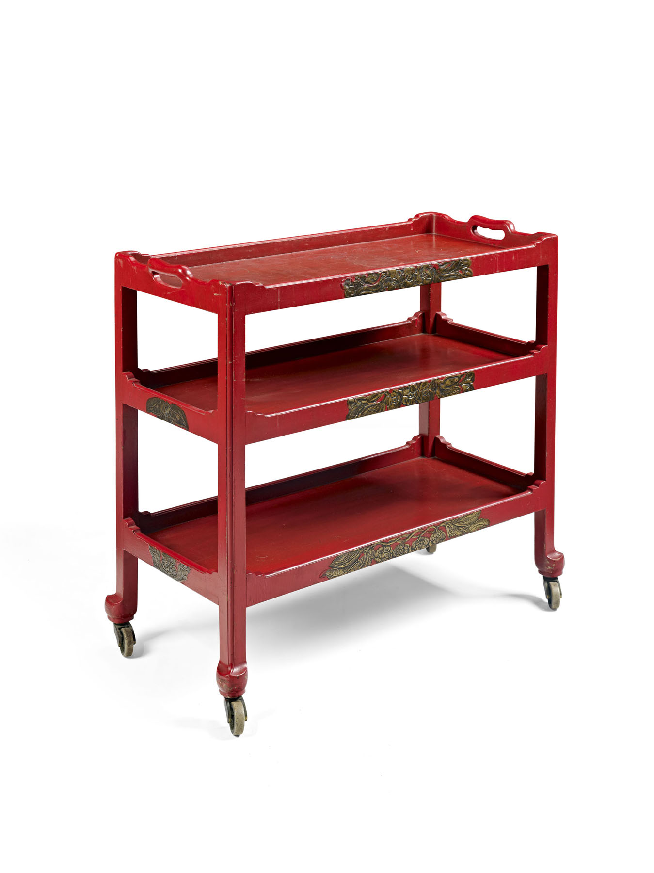 the three galleried tiers with raised gilt foliate panels, raised on moulded square legs ending in pad feet, the red paint a later addition