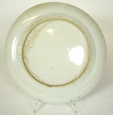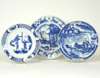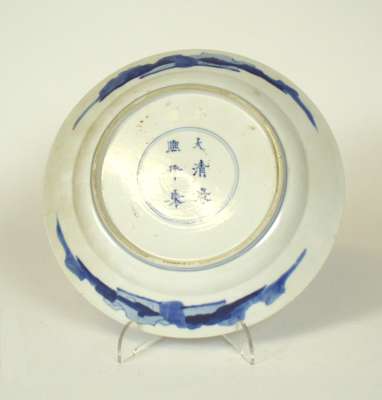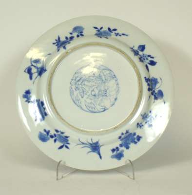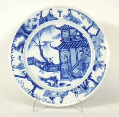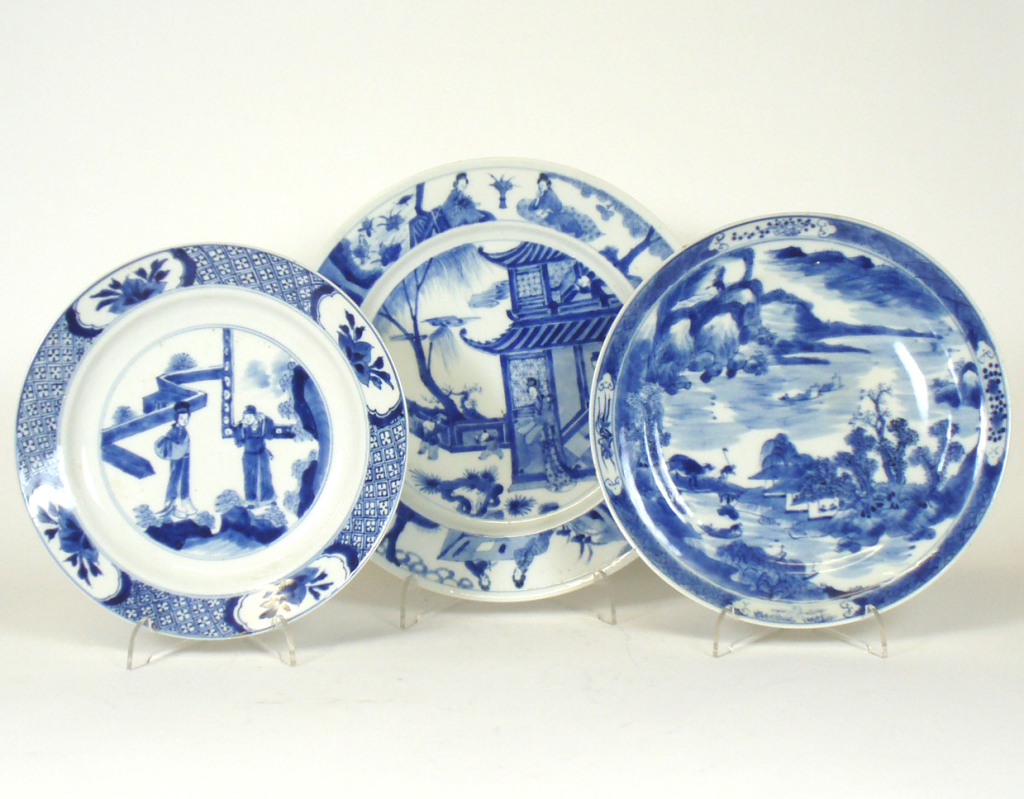 comprising: a plate decorated with figures in a pavillion and garden setting, similar border, blue floral and foliate mark to rear, 25.5cm diameter; a plate decorated with figures in a garden setting, flower and diaper border, blue six character mark to base, 20.5cm diameter; and a later Chinese blue painted plate, decorated with a landscape, 21.5cm diameter (3)