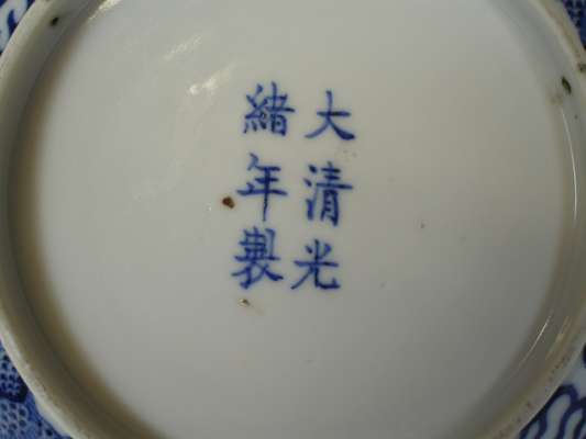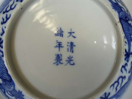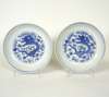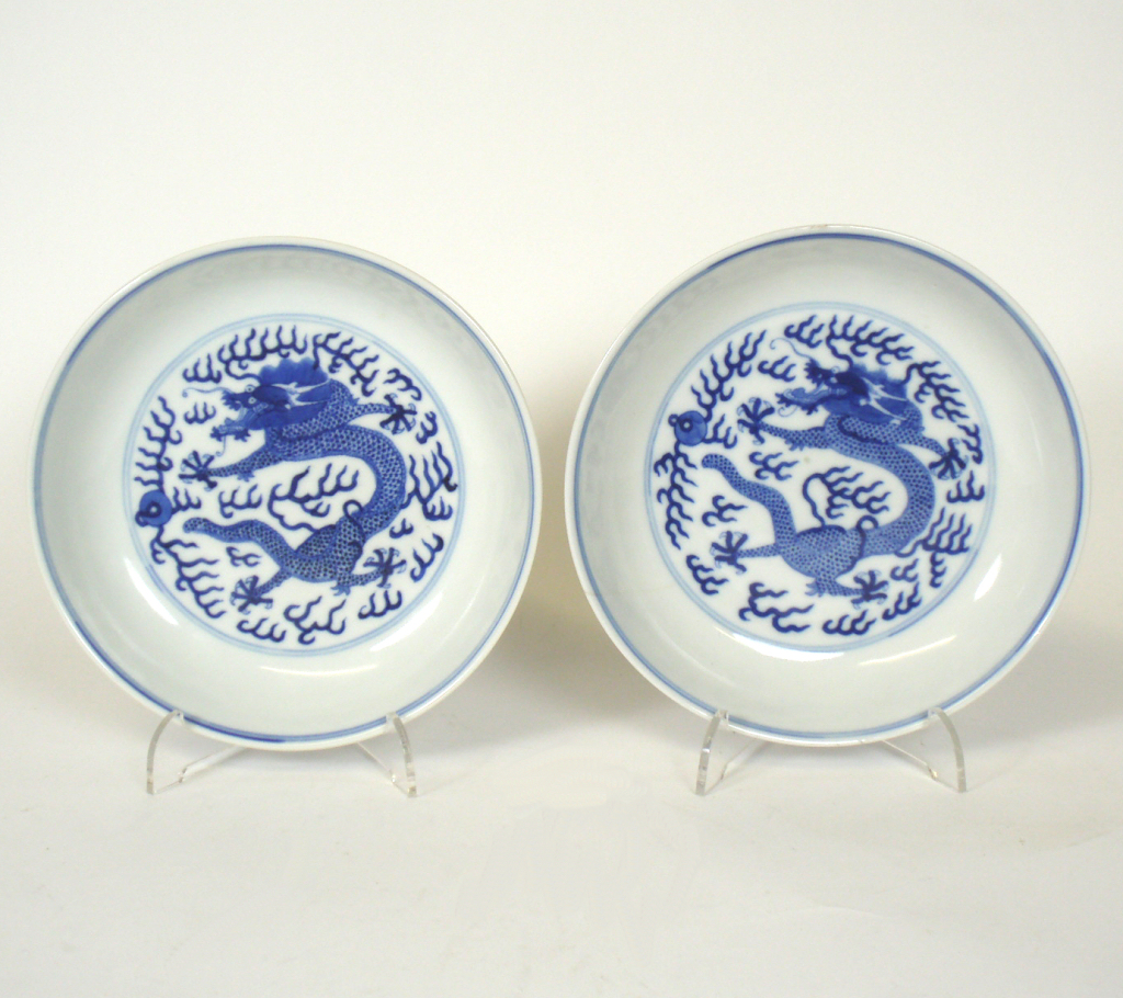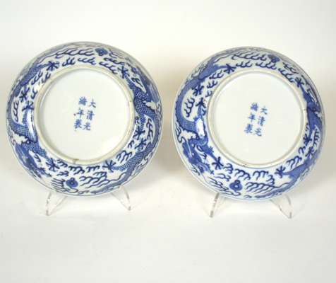 each decorated to the well and exterior with a five clawed dragon chasing a flaming pearl, underglaze blue six character mark (3)