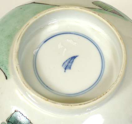 each of circular form with flared rim, decorated with figures in an interior setting, the base with underglaze blue artemisia leaf motif within a double concentric border