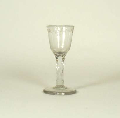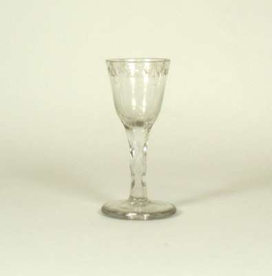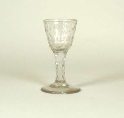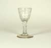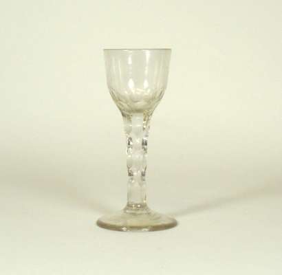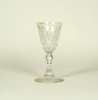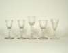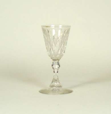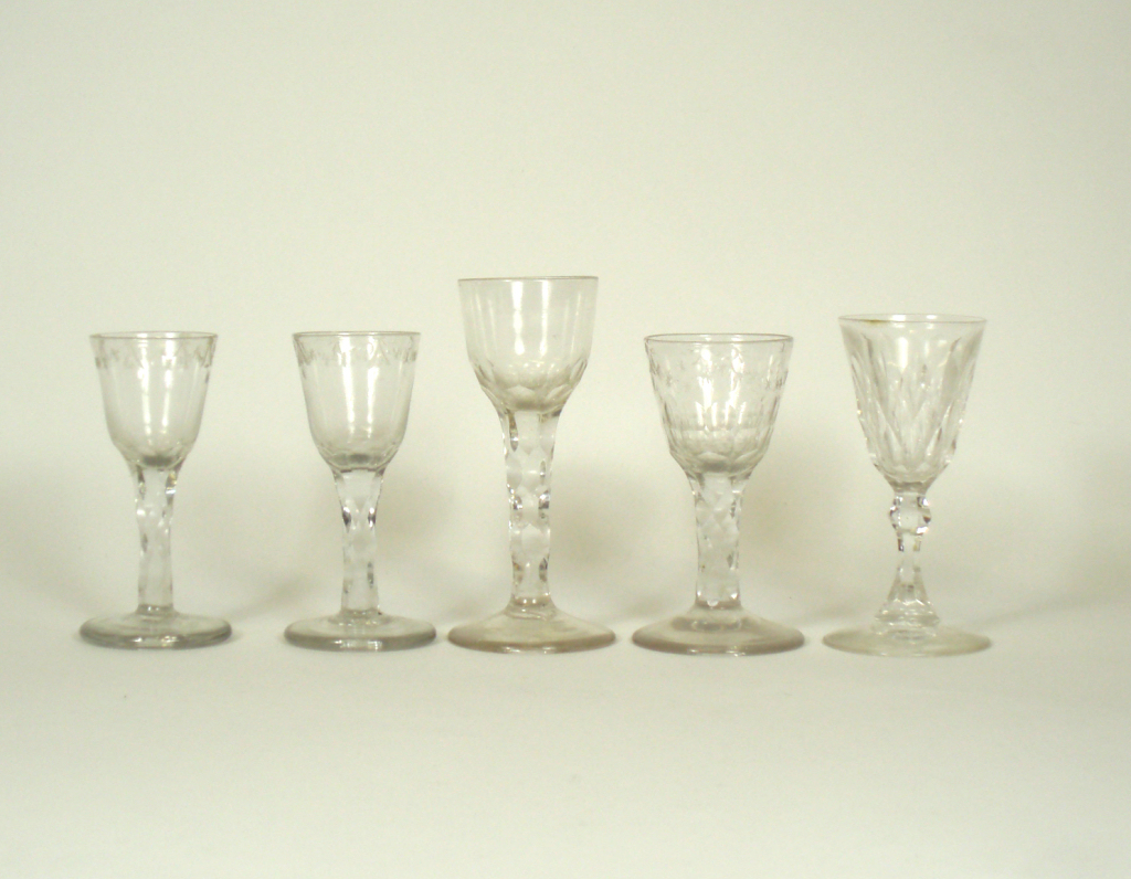 comprising: a pair with naively cut and etched swag decoration, 12cm high; a glass with thumb cut ogee bowl, 14cm high; a thumb cut rounded funnel bowl with cut swags, 12cm high; and a later glass with a faceted bowl, 13cm high (5)