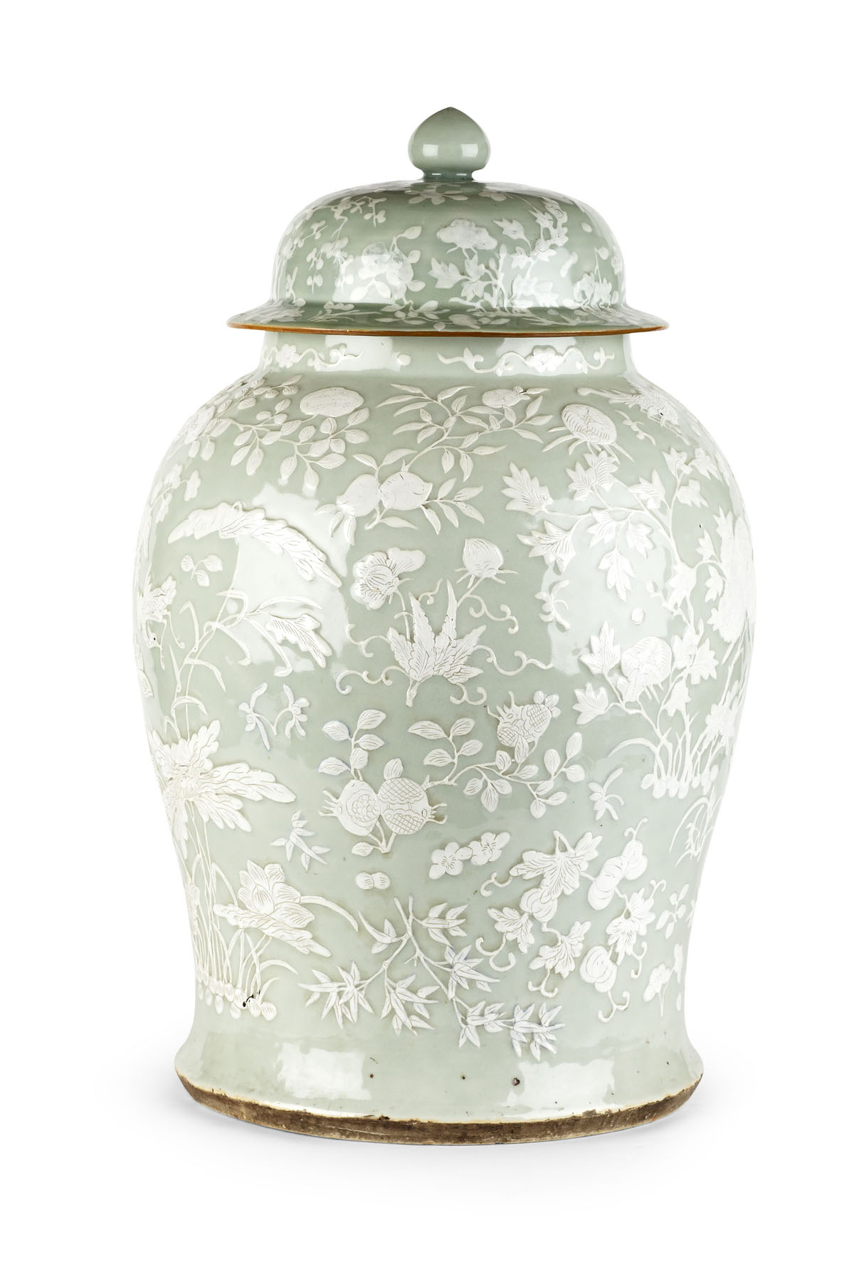 CHINESE CELADON GROUND TEMPLE JAR AND COVER