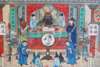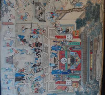 of rectangular form, depicting a variety of torture punishments inflicted upon souls and presided over by the Ruler of Hell in his pagoda, in an ebonised frame