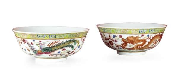 PAIR OF CHINESE POLYCHROME PAINTED DRAGON AND PHOENIX BOWLS