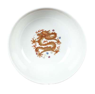 the well painted with a five clawed dragon, the exterior with a dragon chasing a flaming pearl and a phoenix between a scroll border and a wave design border, red six character mark