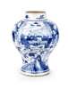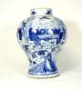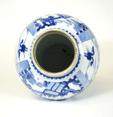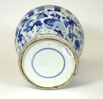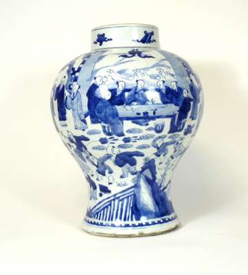 of baluster form, decorated with figures and boys in an interior, double blue concentric ring marks to base