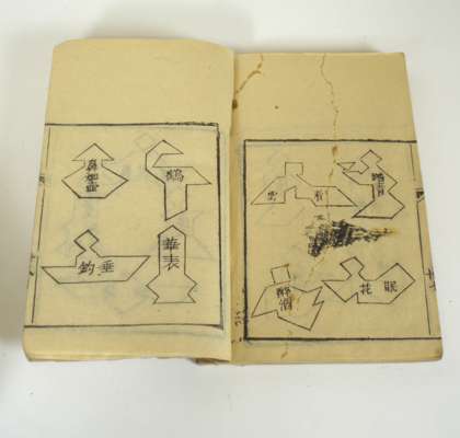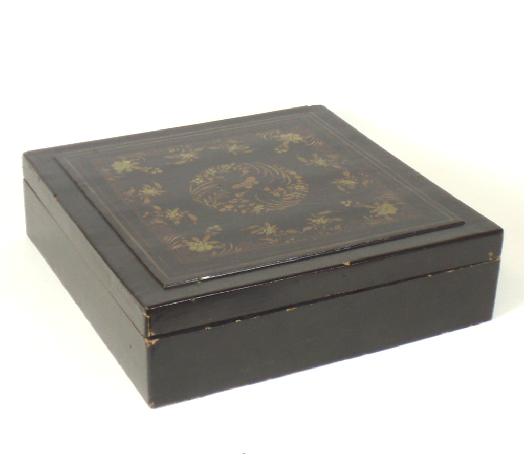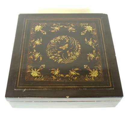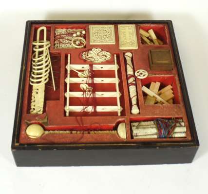 various carved ivory games contained within a square form lacquer box with gilt floral decoration