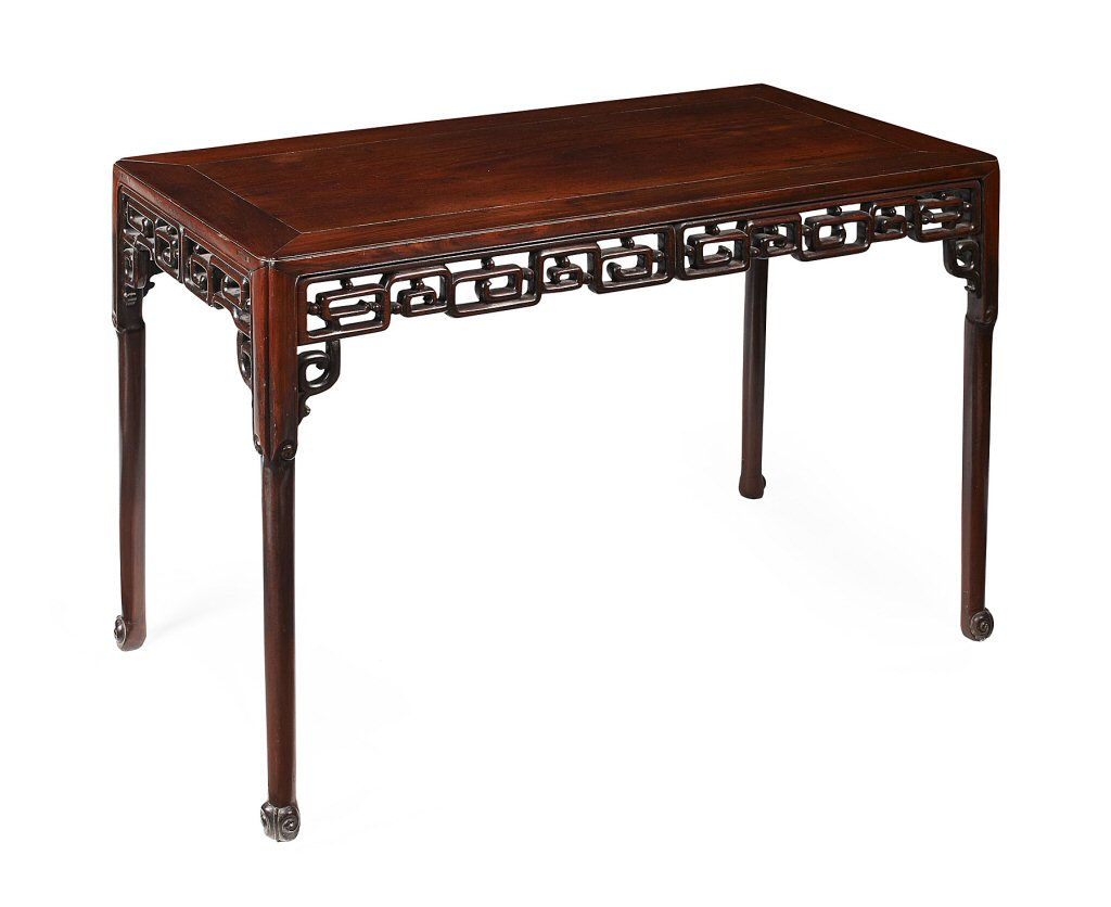 the rectangular top with cleated corners over a pierced and scroll carved frieze, raised on straight column legs ending on stylised scroll feet