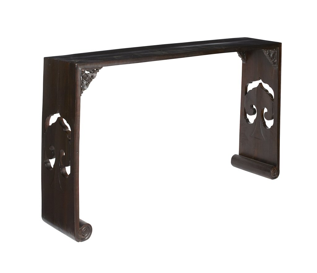 the long rectangular top with carved corner brackets depicting bats, raised on straight side supports with pierced carved linghzi, ending on scroll form feet
