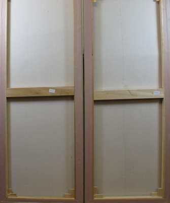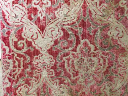 each with deep red silk velvet and gold metallic thread in a repeating scroll pattern; the first 58cm wide, 158cm high; the other 58cm wide, 151cm high (2)