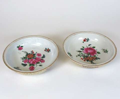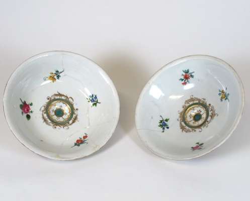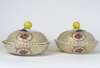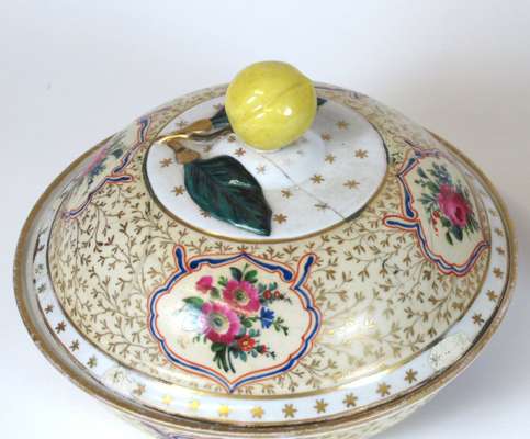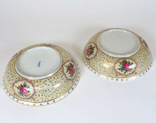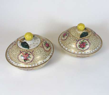 for the Persian market; each circular dish with a dome cover with lemon finial, painted with floral reserves against a pale yellow ground with gilt foliate field, one with Marcolini period underglaze blue crossed swords mark (2)
