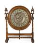 the large circular charger enamelled in red, black, and cream depicting stylised floral motifs, mounted in a wide circular moulded frame supported between turned mahogany columns with cupola form finials, on an arcaded trestle base
