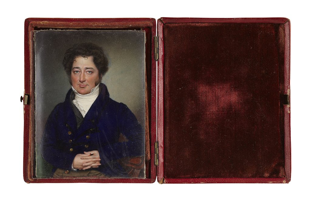 on ivory, three quarter lenth, the sitter wearing a high collar and blue tailcoat, his hands clasped at his waist, inscribed verso 'F.B./ W.S. Lethbridge/ Pinxit ad vivum 1826/ No. 391 Strand London', in a red leather case