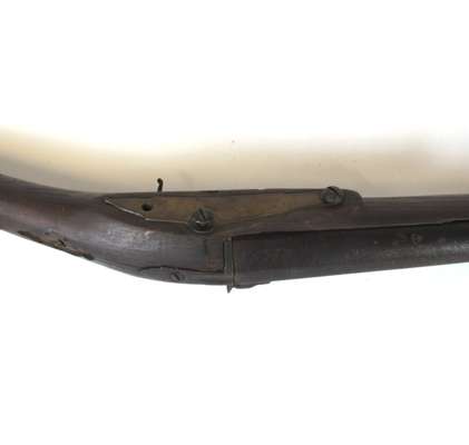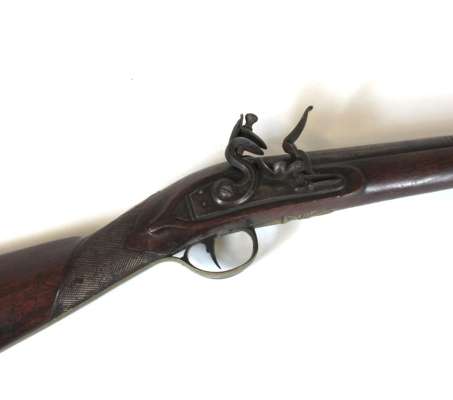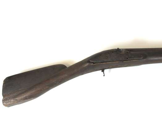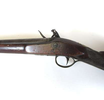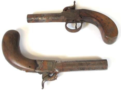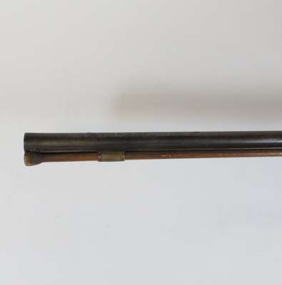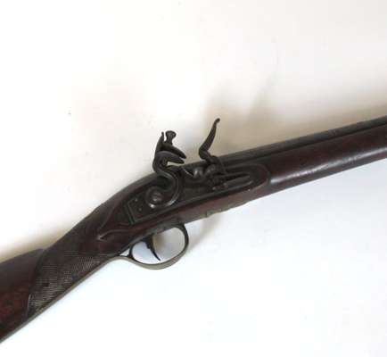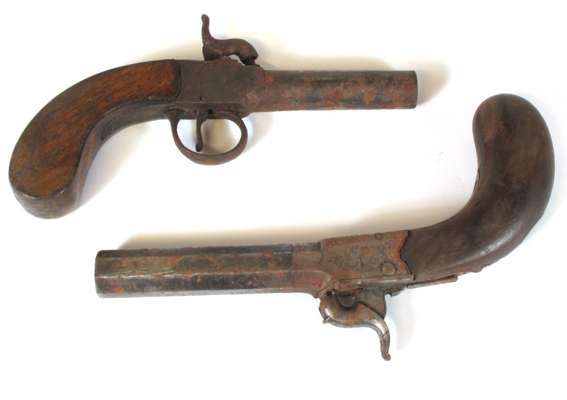 with engraved German silver action, the corroded barrels with Birmingham proof marks; together with two percussion pocket pistols, one signed Malloch Stirling; a flintlock wall gun with missing cock and spring; a flintlock fowling piece circa 1790 with half walnut stock; and a brass scissors type brass bullet mould (6)