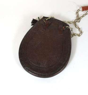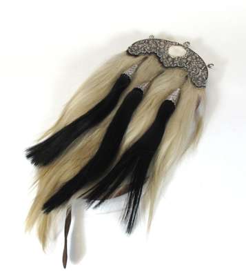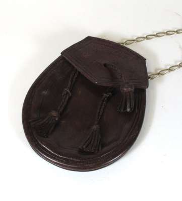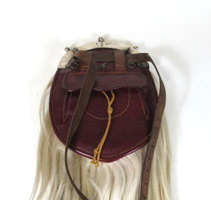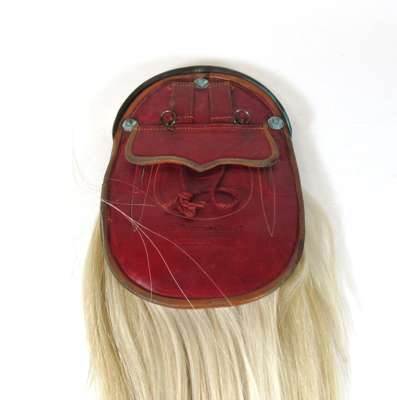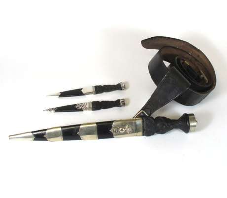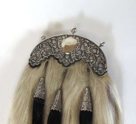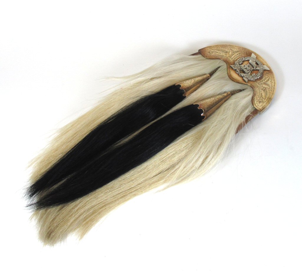 the cantle cast with a blank cartouche and surrounded with stylised thistles, three black horse hair tassels on a white horsehair fringe; together wtih a Gordon Highlanders Regimental sporran, a plain leather sporran, a Highland Dirk, and two silver mounted sgian dubhs (6)