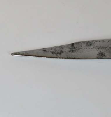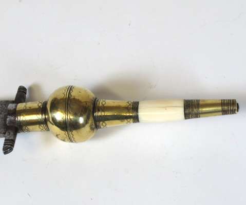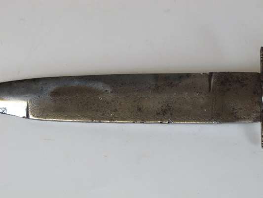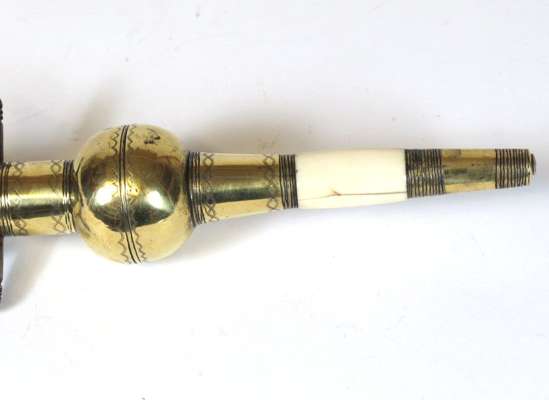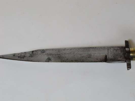 the iron cross guard with brass pommel washer and replacement material to handle with allover engraved geometric design