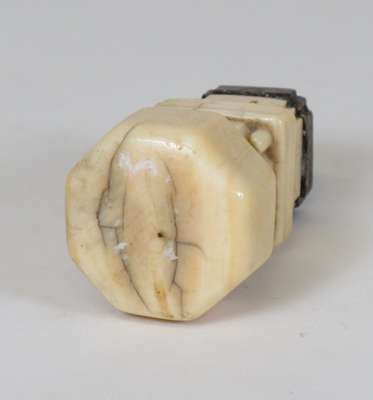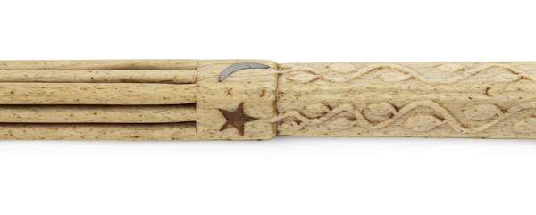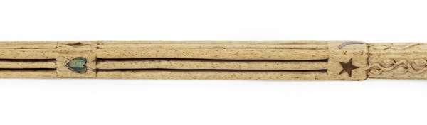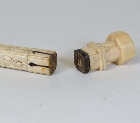 marine ivory pommel loose, the whale bone middle and upper portion of square section with a birdcage and foliate design with inlaid mother of pearl, abalone and tortoiseshell in the shapes of diamond, heart, star and moon motifs, the lower section with a fluted and a spiral pattern