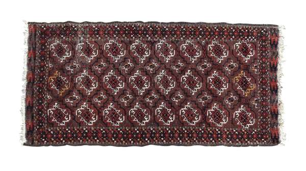 the brown field with allover Tekke gul lattice pattern, within indigo small rosette border between bands