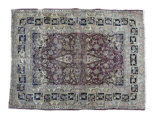 the abrash purple field with four ivory cypress trees forming cross to centre, dark indigo spandrels, within indigo fruiting vine border between bands, signature cartouche to one end