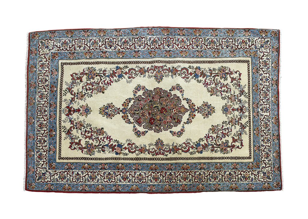 the cream field with central cusped grey medallion with floral swags and pendants, similar open foliate spandrels, within cream floral and cusped vine border between light blue bands