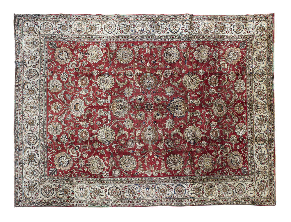 the red field with allover palmette and scrolling foliate vine pattern, within cream palmette, rosette and foliate vine border between cream and light blue bands