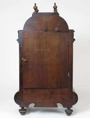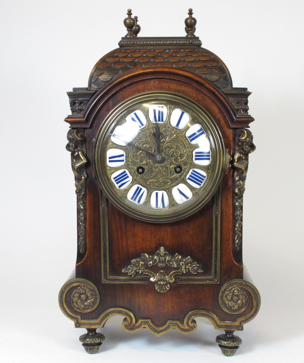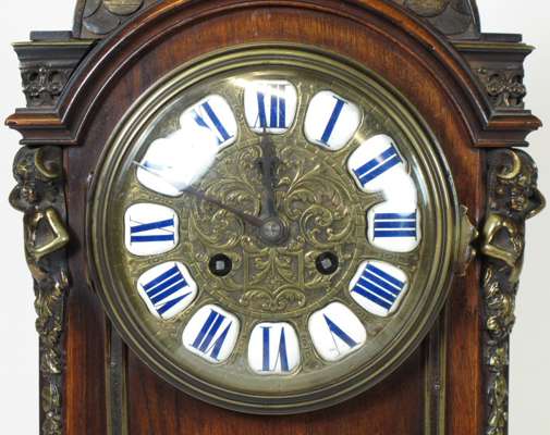 in the Louis XIV style, the brass dial with enamel chapters and an eight day movement striking a bell, the domed case with scale carved decoration and four vase shaped finials, flanked by cherub caryatids and raised on toupie feet