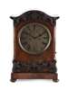 with an engine turned silvered dial and an eight day gong stricing fusee movement, the domed case carved in high relief with scrolling foliage, raised on squat bun feet