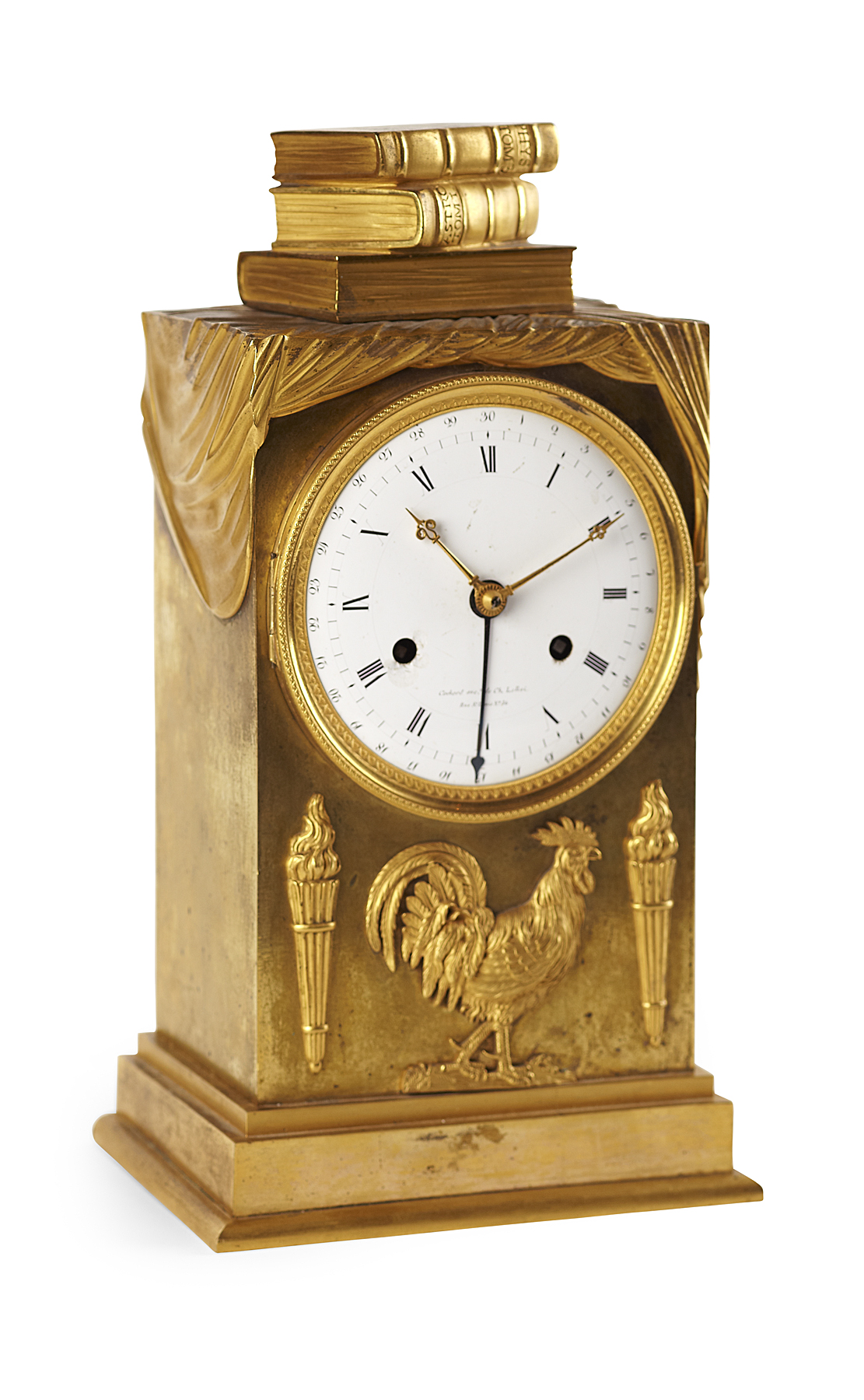 the white enamel dial signed Cachard sucr de Ch. Leroi, Rue St Denis, No 56, with an eight day bell striking movement, the case with applied drapery, cockerel and flaming torch decoration, surmounted by three books