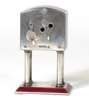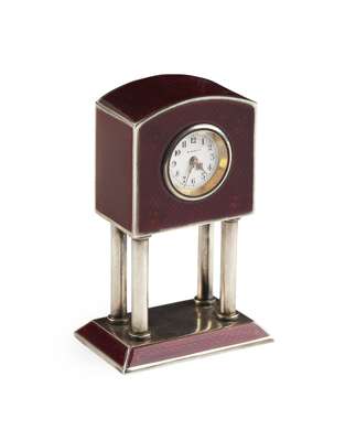 the domed red guilloche enamel case raised on four columnar supports and a spreading platform base, stamped 925
