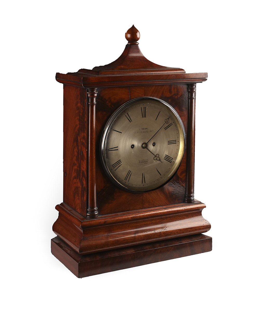 the silvered dial inscribed J. VOAK, 33South Audley Street, London, with an eight day bell striking fusee movement, the arched case with a pear shaped turned finial, raised on a moulded platform base