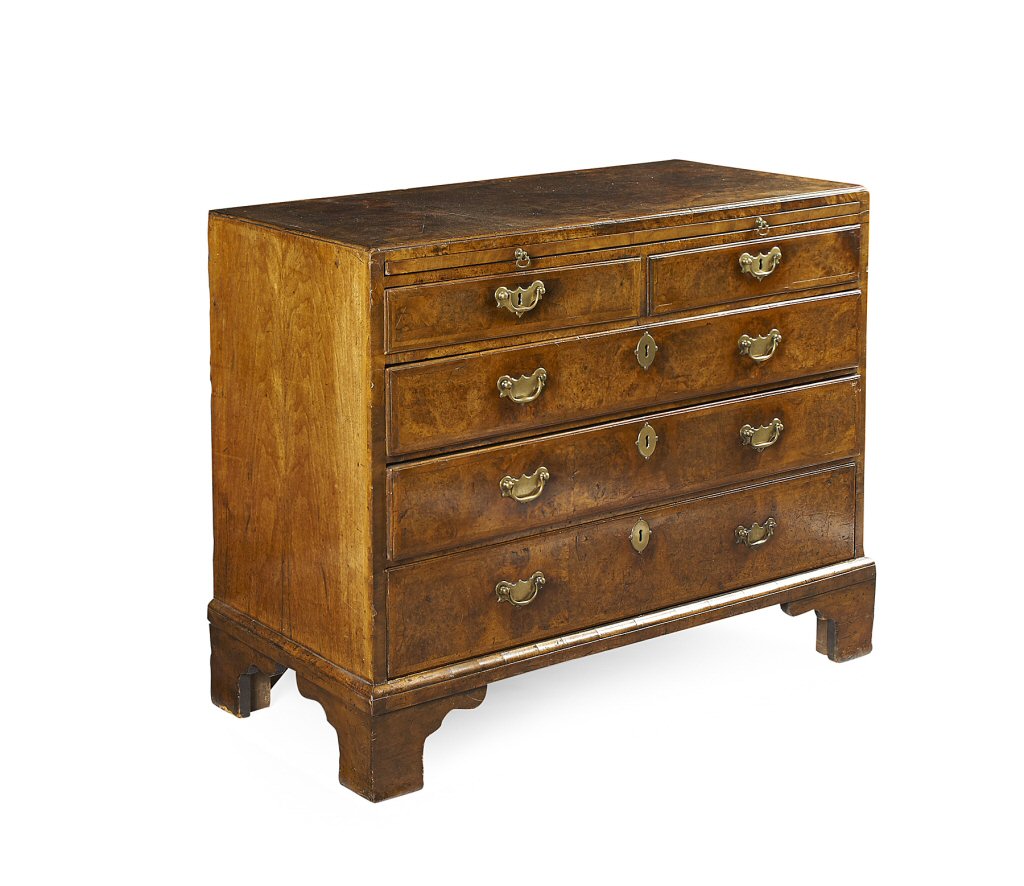 the rectangular top with a caddy edge over a brushing slide and two short and three long graduated drawers, raised on bracket feet