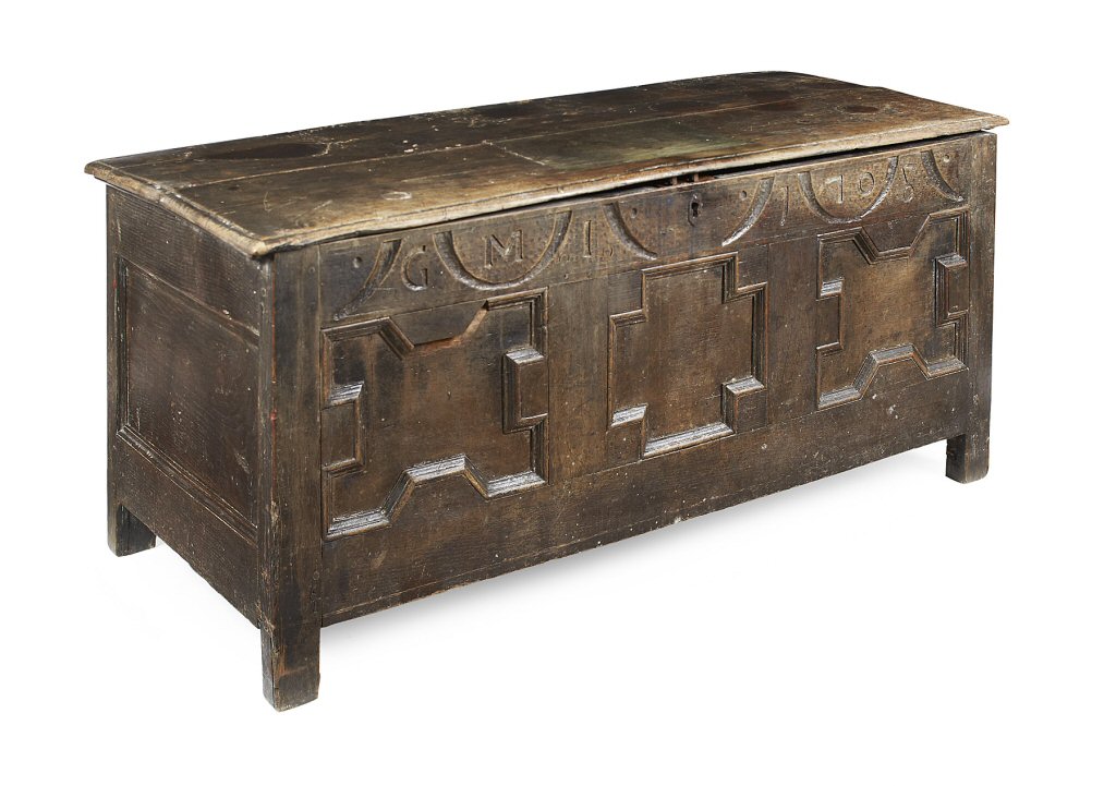 the rectangular hinged top over a front panel carved with initials 'G M I' and dated 1708', the 8 as a stylised thistle, above recess moulded panels, raised on stile feet