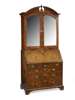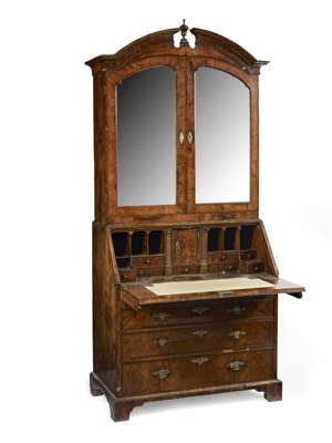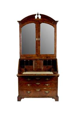 the broken arch pediment centered by an urn finial above a pair of bevelled mirror doors opening to shelves with pigeon holes and small drawers below; the lower section with a slant front opening to an interior fitted with pigeon holes and drawers and a baize writing surface, above three short and three long drawers, raised on shaped bracket feet