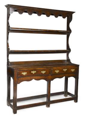 the shelved superstructure with an undulating frieze and shaped sides, the lower section with two short drawers above a shaped apron raised on chamferred square legs united by stretchers