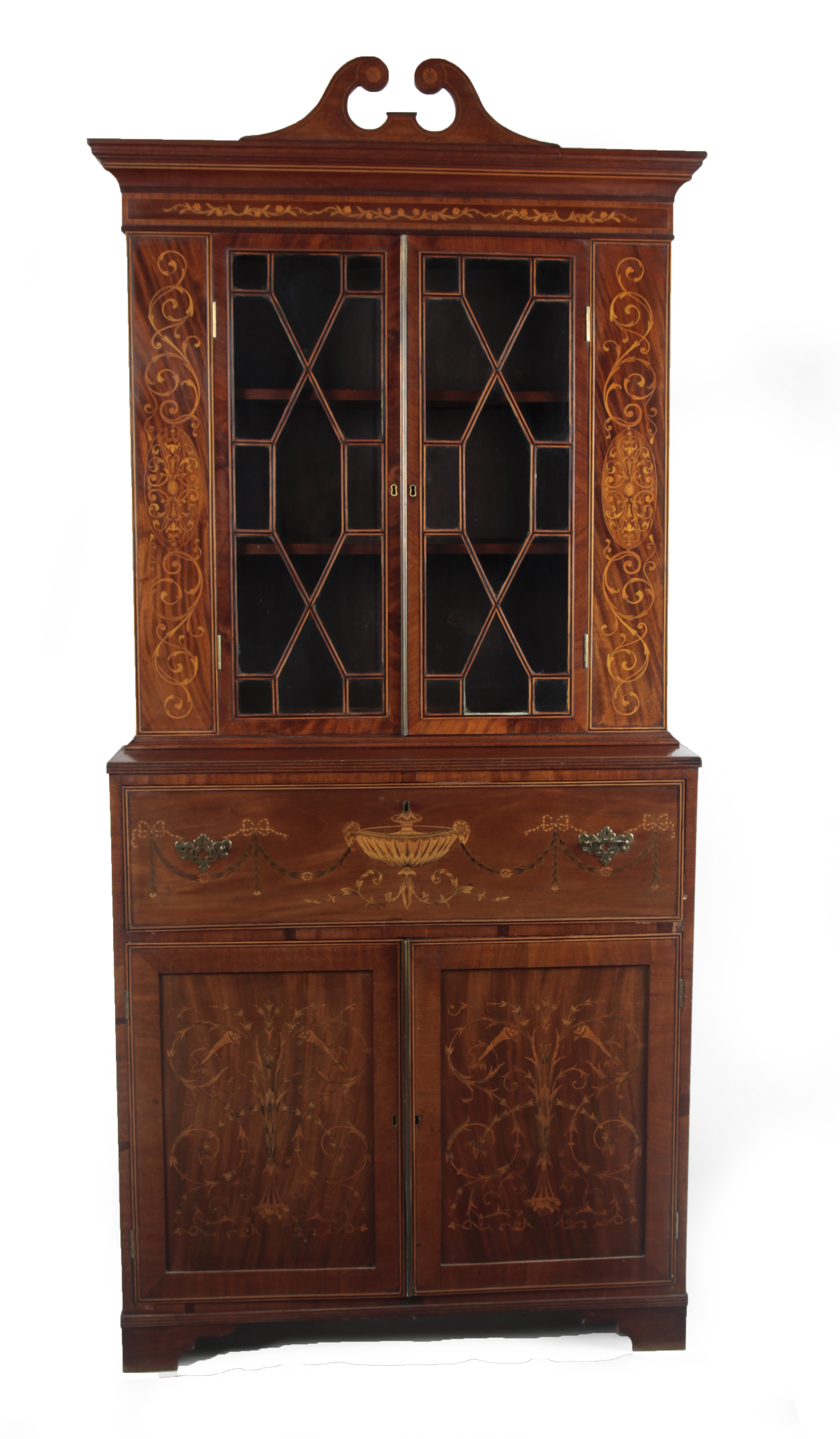 the straight moulded cornice surmounted by a swan neck pediment over a pair of astragal glazed doors opening to shelves; the lower section with a false drawer opening to an interior fitted with pigeon holes and drawers and a leather writing surface, over a pair of cupboard doors, the whole with later inlaid foliate scrolls and garland hung urns; raised on shaped bracket feet