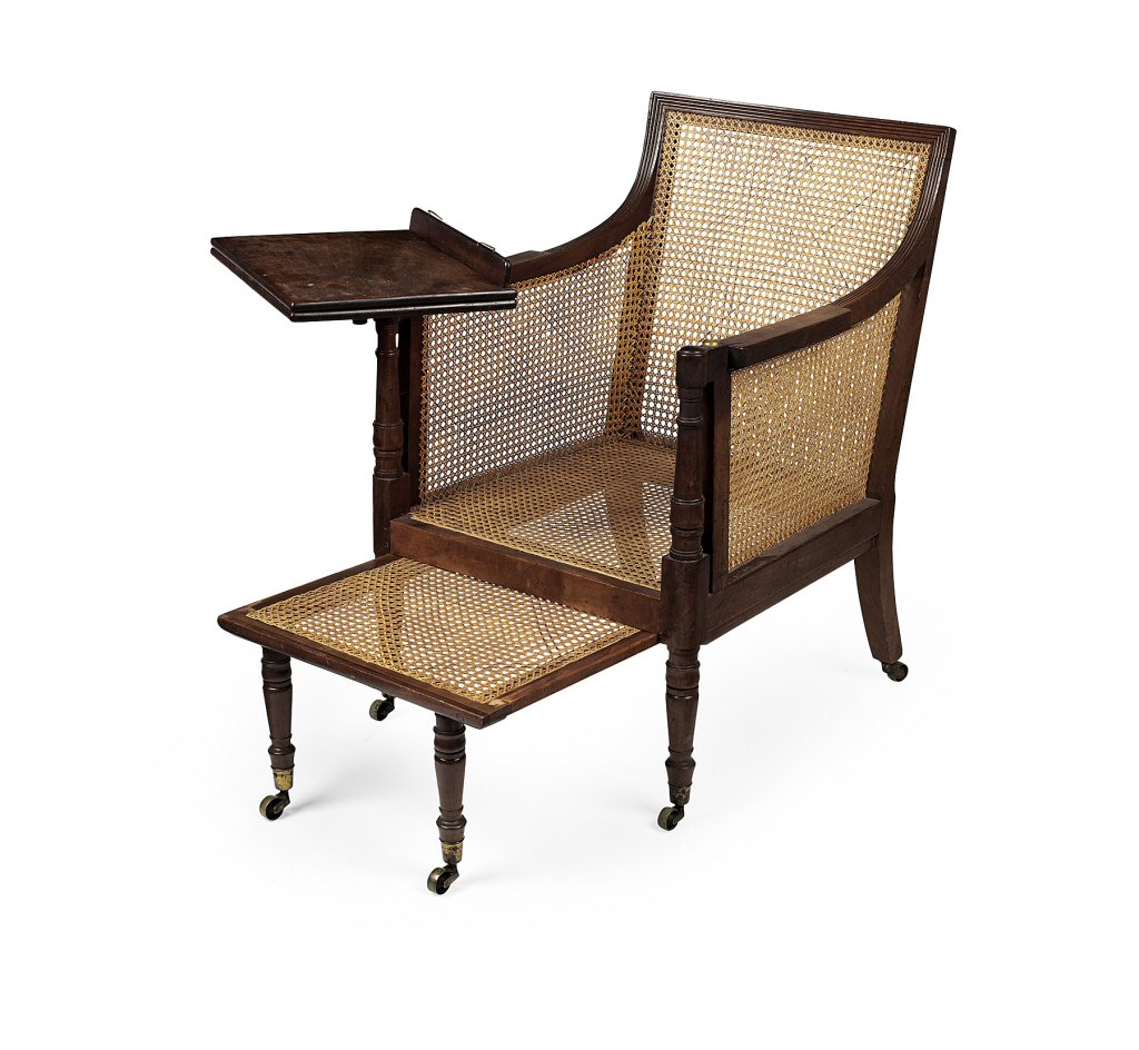 with a square caned back and sides, fitted with an extending caned footrest and reading armature