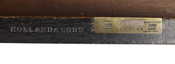 the rectangular top with a straight backrail and a moulded gilt edge, above a central frieze drawer flanked by banks of two short drawers, raised on tapered fluted legs ending on brass castors; the drawer stamped 'Holland & Sons'