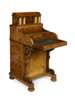 the top fitted with a spring release rising superstructure over an ogee shaped hinged cover opening to a writing surface on carved bracket supports, the case with four real drawers and four dummy drawers opposing