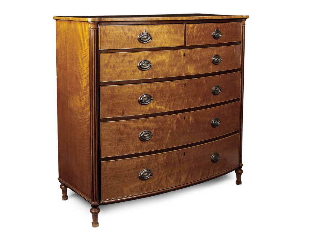 the shaped top with outset rounded corners over two short and four long graduated drawers flanked by inlaid corner columns, raised on turned feet