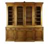 the plain moulded breakfront cornice centred by a carved sunflower above a flat carved lappet frieze and four glazed doors opening to shelves, the conforming base with drawers over channel carved panel doors, the corner blocks carved with sunflower panels, on a plinth base