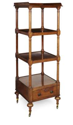 the square three quarter gallery top over four tiers separated by ring turned columns, over a single base drawer, raised on baluster turned legs ending on brass castors