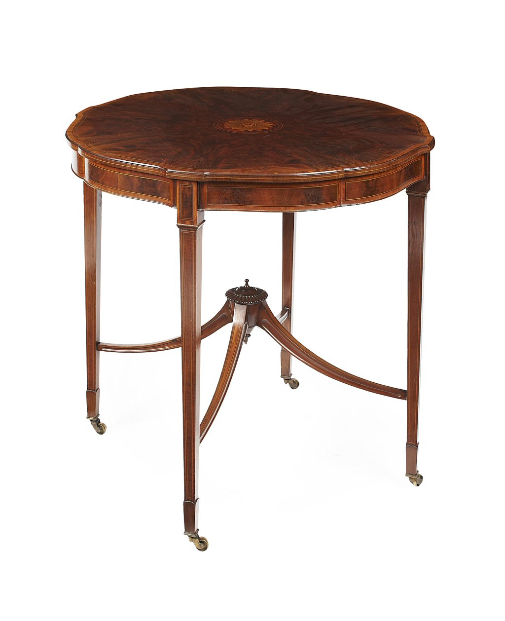 the shaped circular top centred by a foliate medallion inlay, over a conforming frieze and raised on square tapered legs joined by arched stretchers joined by a central urn, on brass castors