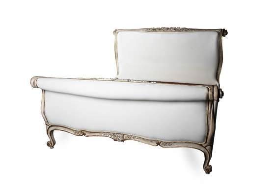 LOUIS XV STYLE CREAM PAINTED, PARCEL GILT AND UPHOLSTERED BED