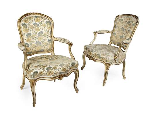 PAIR OF LOUIS XV PAINTED AND PARCEL GILT FAUTEUILS